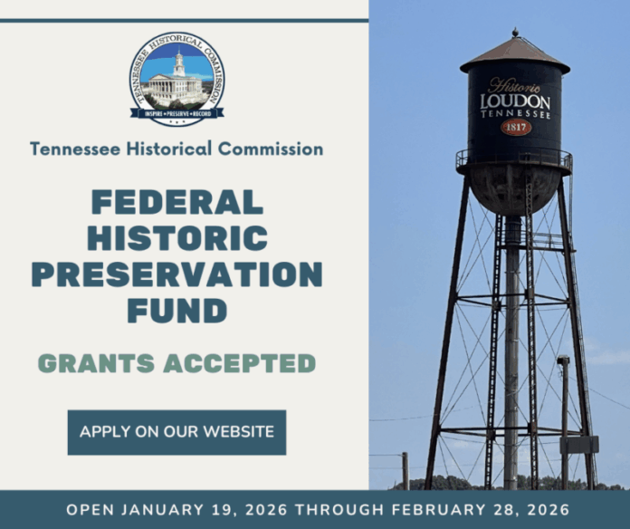 Tennessee Historical Commission, the State Historic Preservation Office, is accepting Federal Historic Preservation Fund Grant applications from January 19, 2026 through February 28, 2026. The grant program reimburses 60 percent of the project costs, with a 40 percent match of project funds from the grantee.