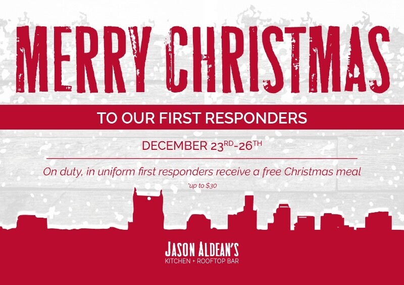 – Free Christmas meals for on-duty first responders, up to $30 each at Jason Aldean’s Kitchen and Rooftop Bar and Posty’s, located at 305 & 307 Broadway from December 23-26.